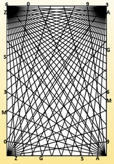 Each line coming from each corner represents either a letter in your loved one’s name or a number in your loved one’s date of birth or date of death. The angle of each line corresponds to the proportional location of the number or letter on the 90 degrees surrounding each corner.