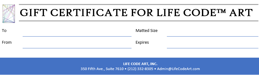 To order a gift certificate please email admin@lifecodeart.com or call (212) 332-2345 and we will be happy to place your order.